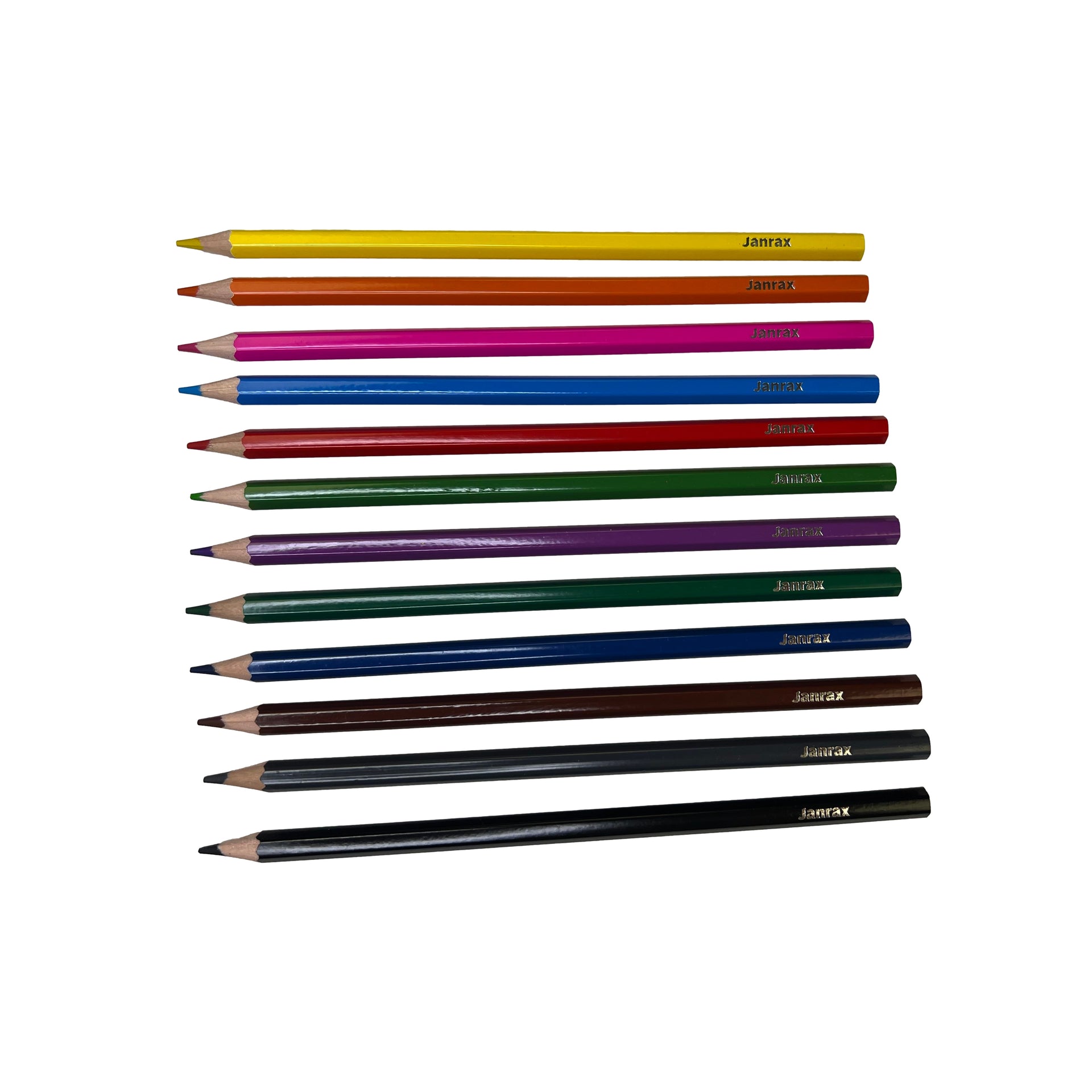 Pack of 144 Classroom Colouring Pencils by Janrax. Consisting of 12 Colours, this pack will provide 12 sets of 12 colours in a bulk pack. Ideal for school classrooms, studios, artists and activities. Quality pre-sharpened coloured pencils. Colours include Black, Grey, Brown, Red, Yellow, Orange, Purple, Blue, Light Blue, Green, Light Green and Pink. Crafted with utmost care, our colouring pencils feature a strong and durable lead that delivers smooth, consistent lines on various paper surfaces.